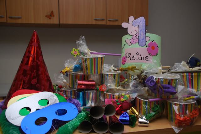 de feestartikelen kwamen uit de Ava, de mooie kroon hadden de kinderverzorgsters van de crèche gemaakt. In de gekleurde pottekes zaten ong. 3 chocoladekoekjes en 1 boterkoekje in de vorm van een dier. Verder in hetzelfde zakske ook nog een ballon, alles samen gebonden met een strikje met daarin een potlood.